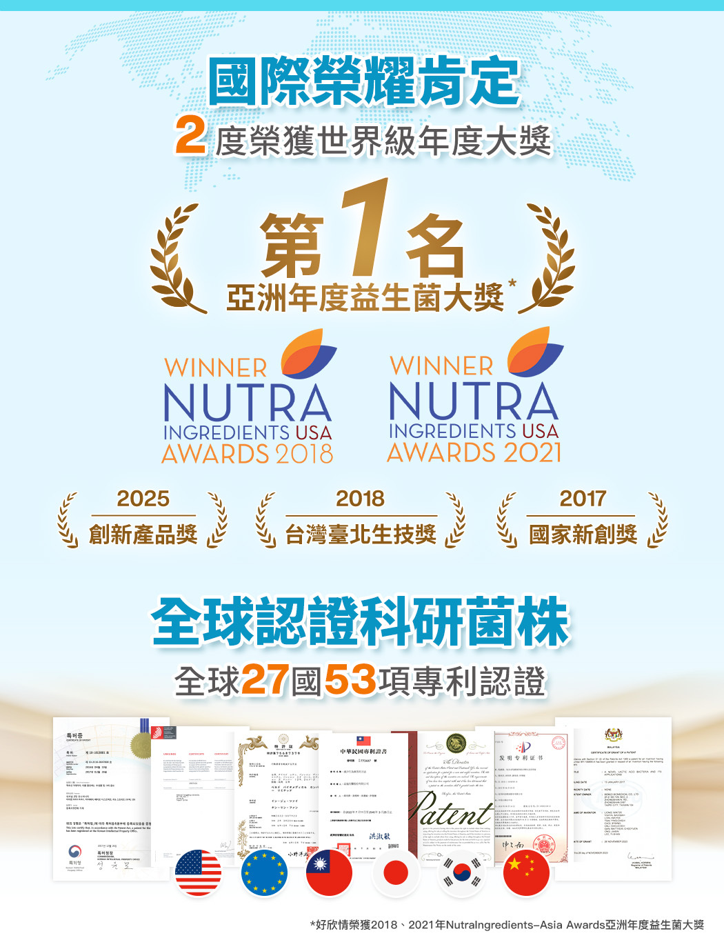 ◈ 2021 & 2018亞洲年度益生菌大獎NO.1