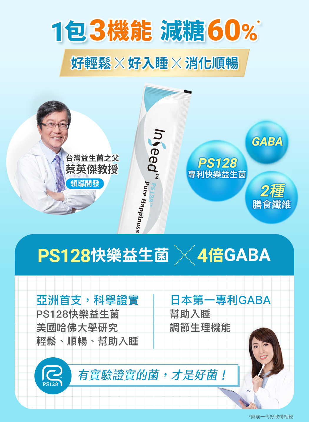 PS128™為亞洲首支經嚴謹實驗開發之「快樂益生菌」,可幫助入睡的機能型菌株。目前已通過中華民國專利(I509070)、日本專利(6035578)、韓國專利(10-1813881)、歐盟十四國專利(2937424)、美國(US10188684)及中國(3071221)等多國專利。