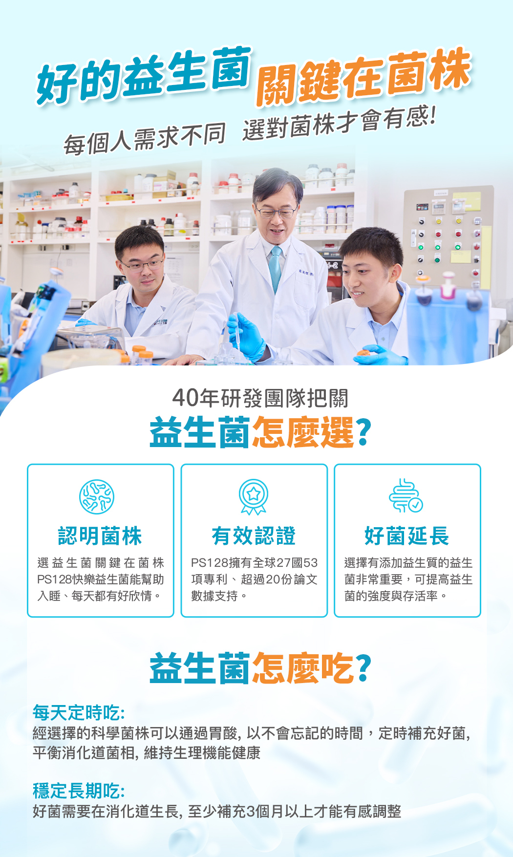 PS128™為亞洲首支經嚴謹實驗開發之「快樂益生菌」,可協助入睡的機能型菌株。十四國專利(2937424)、美國(US10188684)及中國(3071221)等多個國家專利。