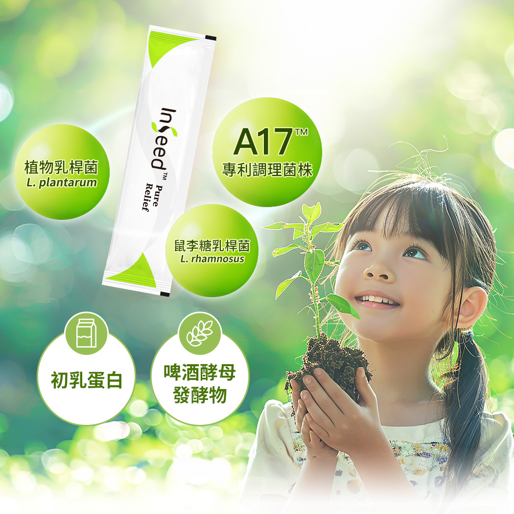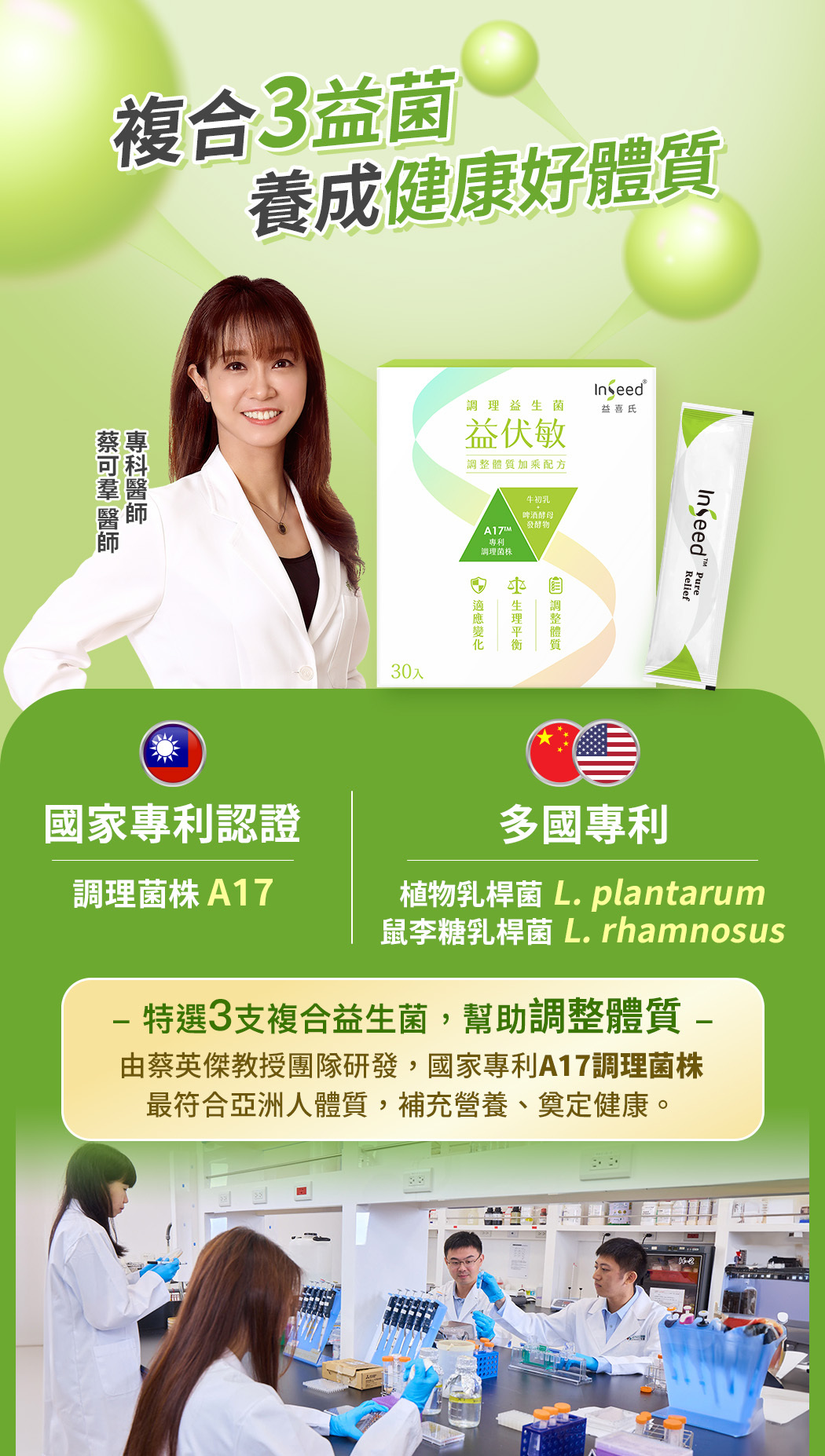 國家專利A17™調理益生菌,搭配鼠李糖乳桿菌與植物乳桿菌,幫助調整體質、促進生理機能平衡。