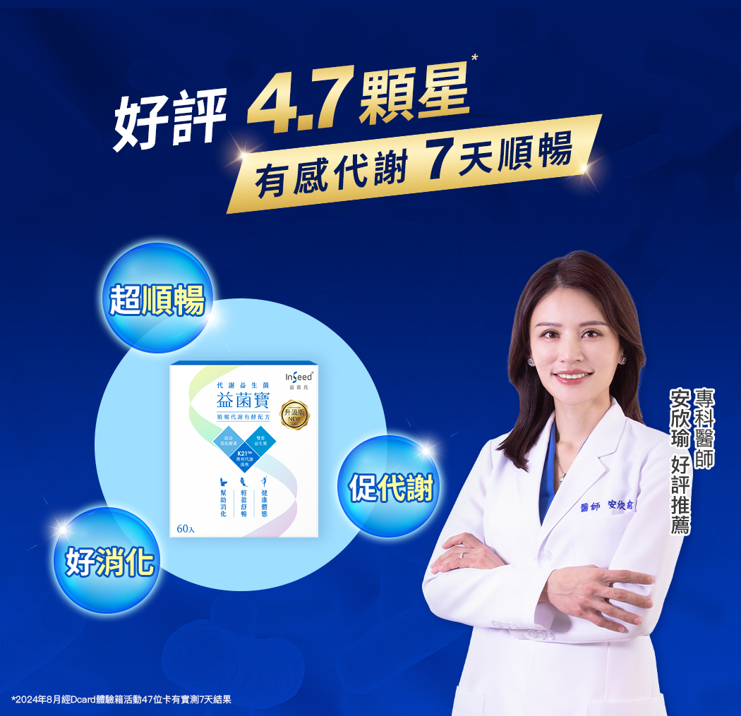 由亞洲益生菌權威蔡英傑教授領導研發的益菌寶代謝益生菌,獲98%超高回購率、Dcard好評4.7顆星!添加K21代謝菌株及美型複合菌株、雙重益生質與可以幫助分解澱粉、蛋白質、脂質的綜合消化酵素,能將食物分解成小分子,由內而外提升順暢力、消化力、代謝力,改善上班族久坐少運動、餐餐外食族消化不順、排便不順等問題,升級版減糖40%,顆粒更大,不黏牙,好吞嚥,口感佳,從小到老全家都愛。