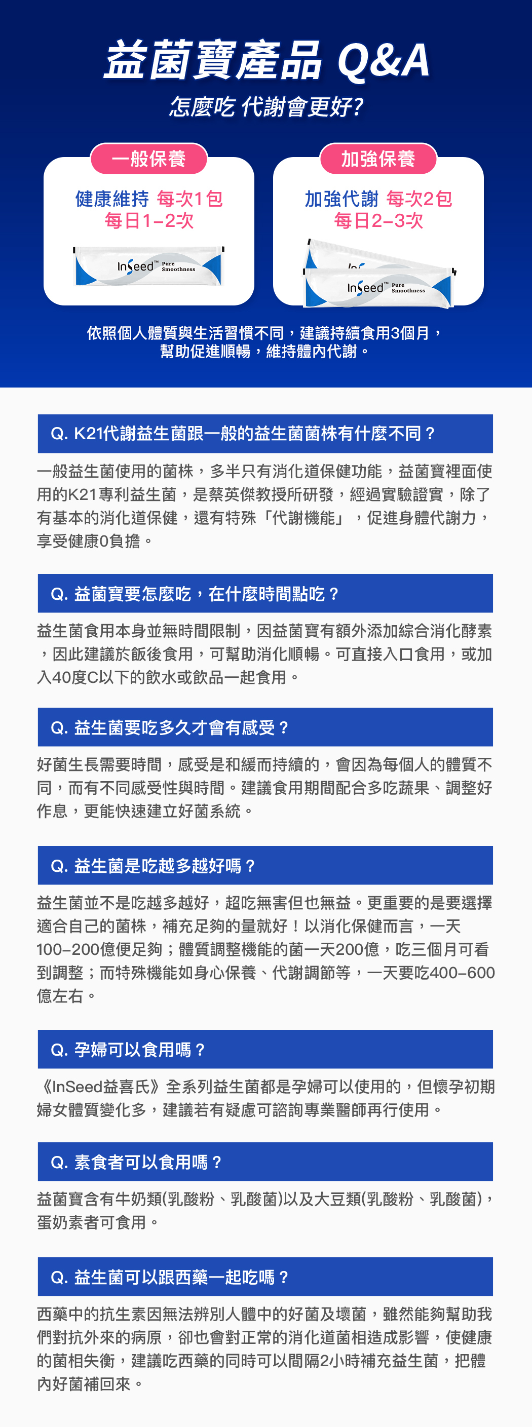 益生菌要空腹吃嗎?益生菌飯後吃還是飯前吃?究竟益生菌什麼時間吃才對?其實好的益生菌什麼時候吃都可以,為了讓益生菌發揮最佳效果,每天定時補充、並且至少持續補充三個月,才是幫助好菌穩定生長與調整體質的關鍵。益菌寶額外添加消化酵素(含澱粉、蛋白質、脂質分解酵素),因此飯後食用效果最佳。一般保養每日吃1-2包,加強保養每日吃2-3次,每次2包。孕婦與素食者可根據產品成分評估是否適合食用,並在有疑慮時諮詢醫師。
