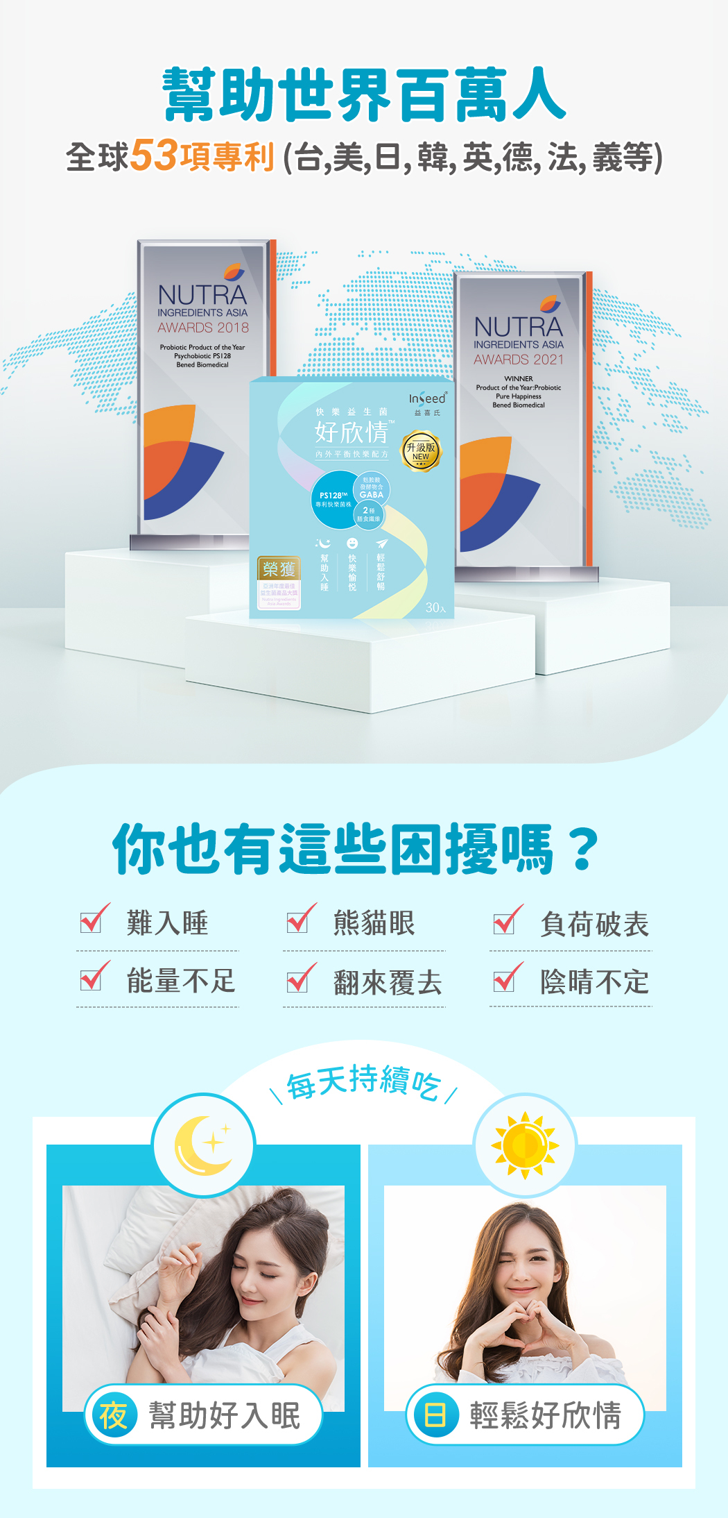 好欣情 PS128™ 快樂益生菌+GABA,有效提升快樂因子,幫助放鬆入睡,為第二天的忙碌養精蓄銳。