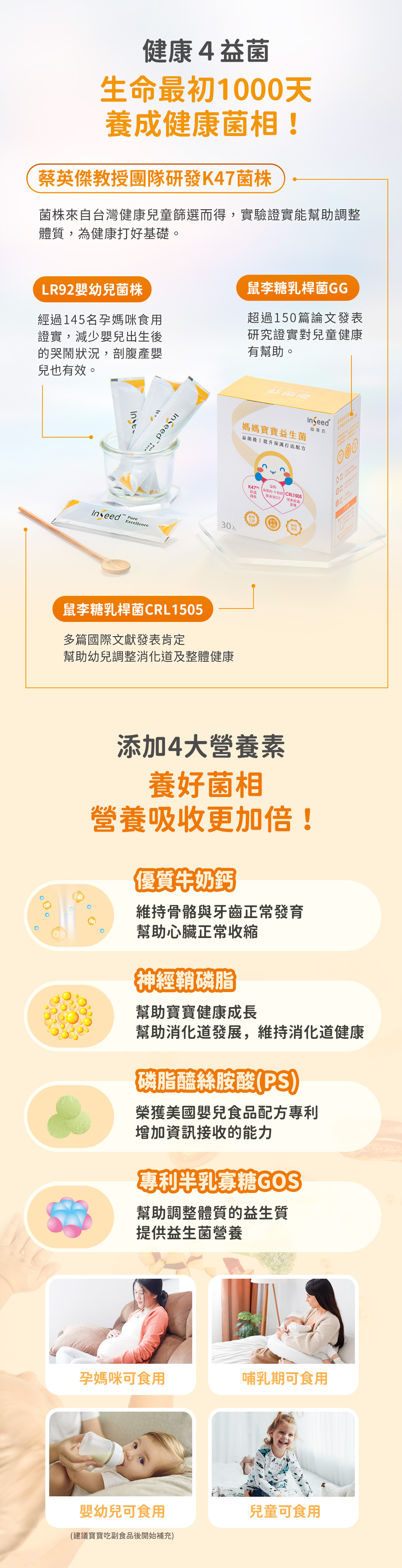 益菌優是專門為母嬰幼族群打造的益生菌,K47TM機能益生菌+CRL1505+LR92複合專利菌,能幫助調整體質、健康打底。搭配神經鞘磷脂、優質牛奶鈣、磷脂絲胺酸(PS)、專利半乳寡糖GOS 多項嚴選輔料,幫助從孕前、孕程到產後,媽媽寶寶們的關鍵補養。