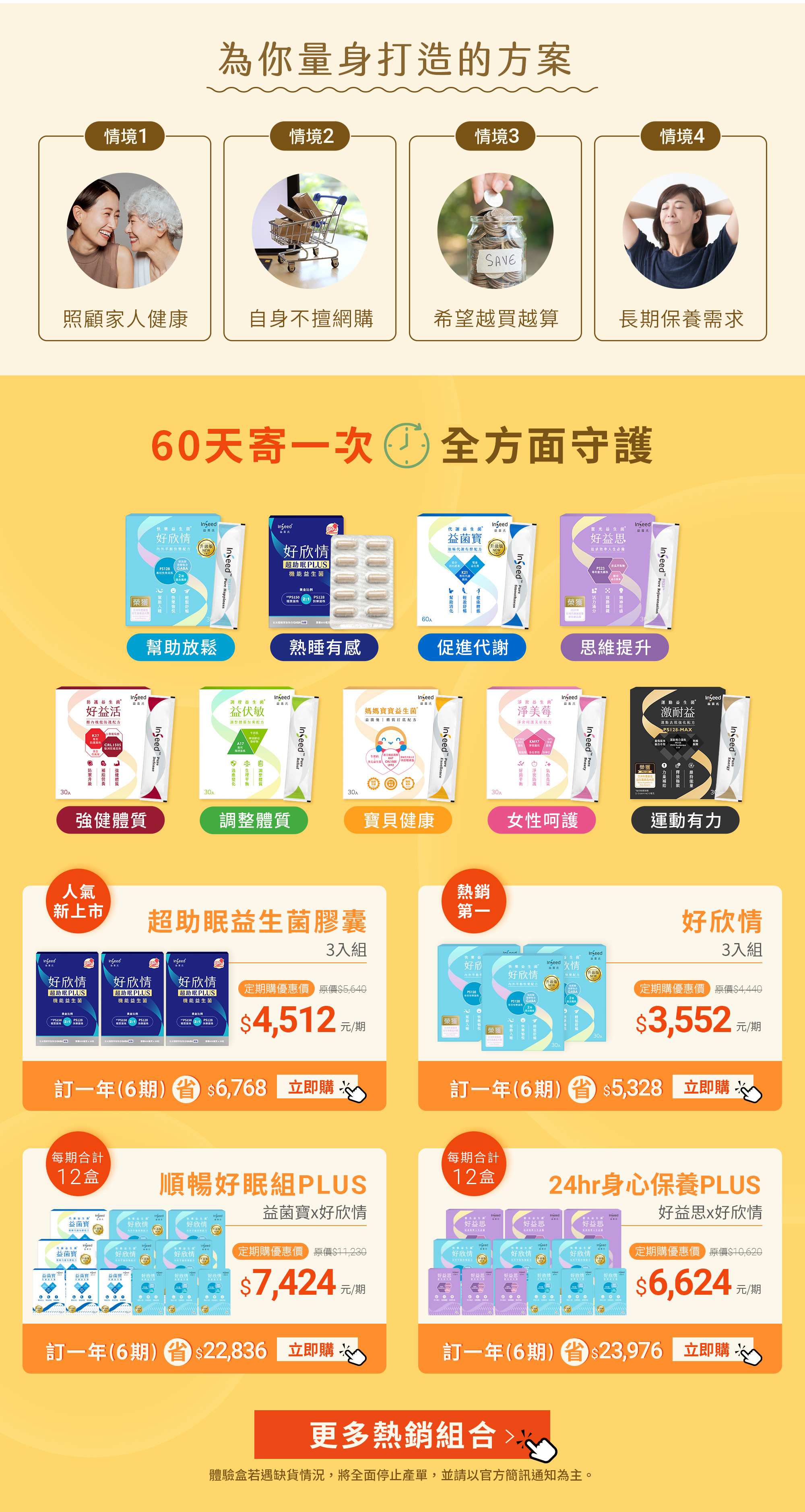好欣情超助眠機能益生菌採用黃金2:1舒眠成分比例,希望從體內平衡,打造自然好睡眠體質,透過:「輕鬆愉悅 × 喚回內在生理時鐘 × 建立自然睡眠週期」的三大睡眠關鍵,打造0副作用、0鈍感、0負擔、0依賴、0反彈的自主好睡眠力。